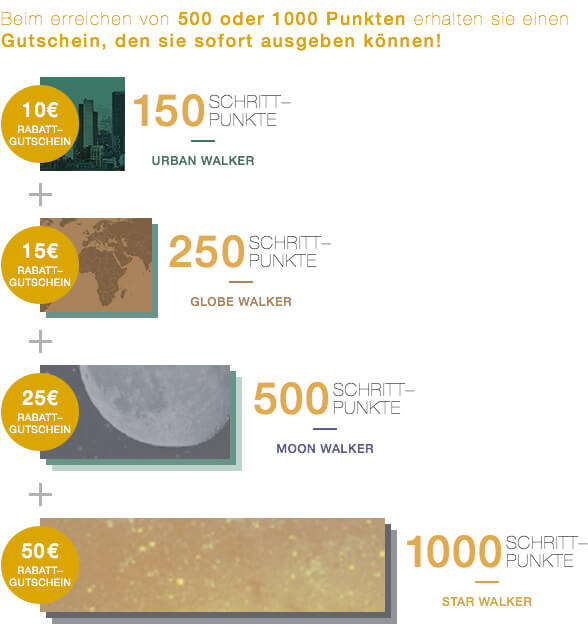 Alle zum Benefeet-Programm angemeldeten Kunden können die Voucher beim Einkauf auf geox.com und in den am Programm teilnehmenden Geox-Geschäften und -Outlets erhalten. Jedes Jahr haben Benefeet-Kunden die Möglichkeit, 4 Steps zu erreichen und 4 Voucher mit unterschiedlichem Wert zu erhalten. In den Geox-Outlets können die Voucher nur für Produkte zum vollen Preis der aktuellen Kollektionen (falls vorhanden) eingelöst werden, nicht aber für Kollektionen der vergangenen Saisonen. Nicht mit dem Willkommensangebot, Vouchern, Rabatten, Sales zu Saisonende oder Couponcodes kombinierbar und nicht für Reinigungsprodukte, Einlegesohlen/Fußbetten, Socken, Geschenkgutscheine, Einkaufstaschen, Reparatur- und Schneiderserviceleistungen, Schnürsenkel anwendbar. Die Voucher sind bis zum 04/12/2025 erhältlich und bis zum 07/12/2025 einlösbar.