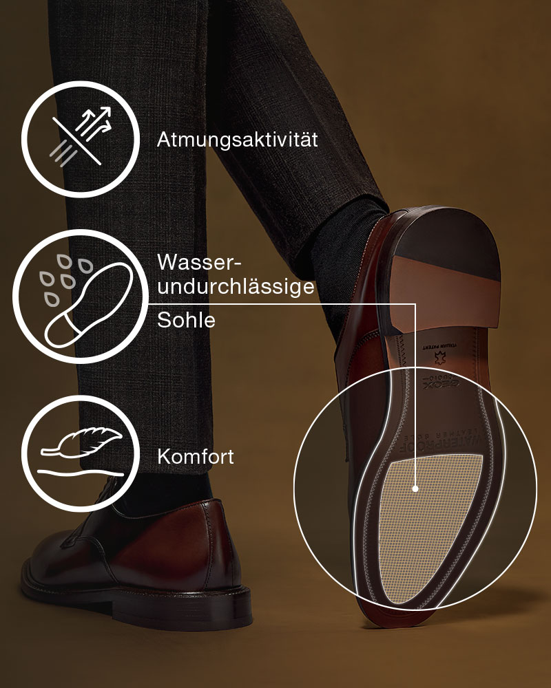 Der formelle Stil der Lederschuhe trifft auf die Technologie von Geox und münden in einer Kollektion mit wasserdichter Sohle und atmungsaktivem Tragekomfort.