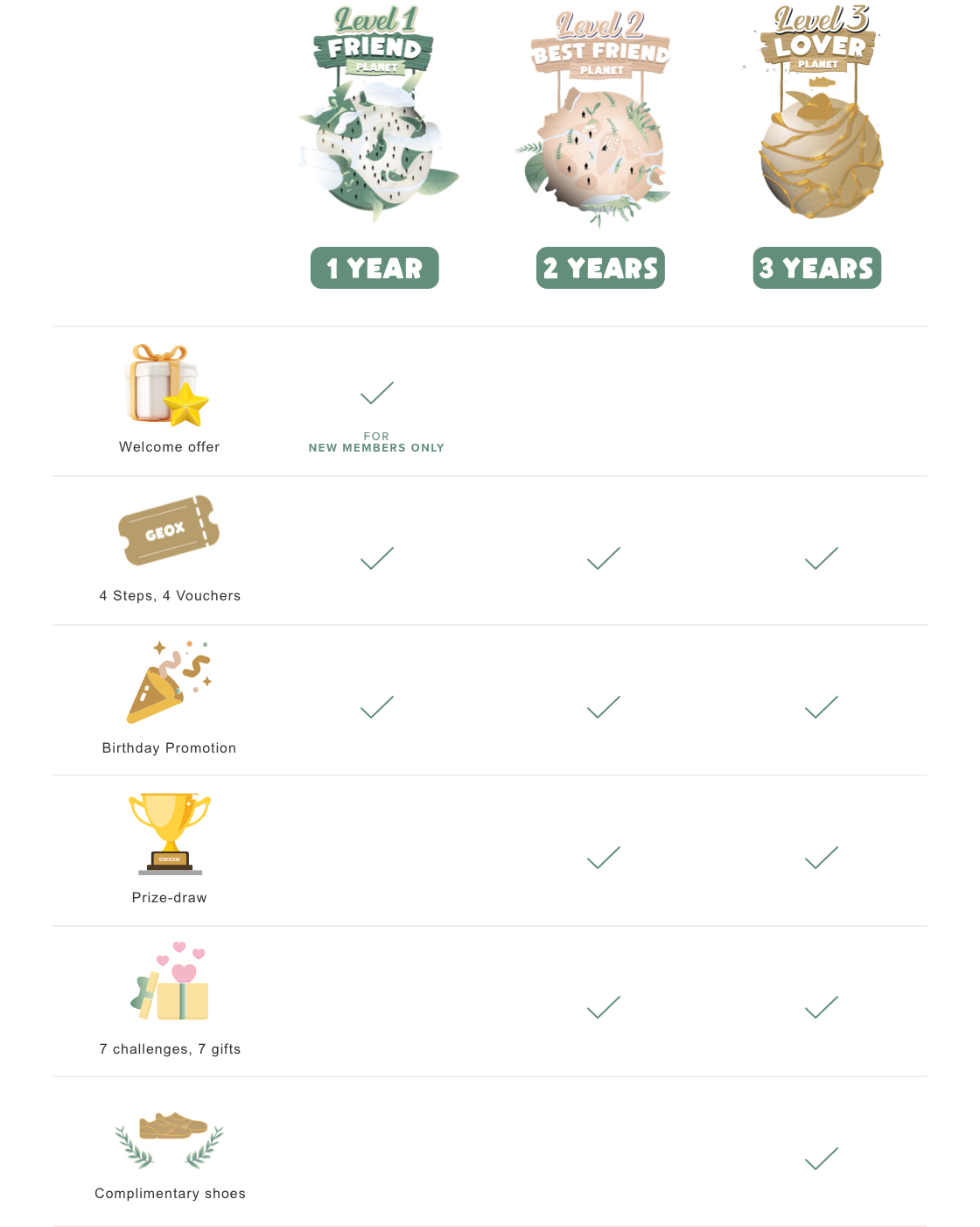 Customers with Lover status (those who have been purchasing for 3 consecutive years and who have reached the last step) are entitled to a pair of shoes of their choice - for free! The shoes can be chosen from any store that takes part in the Benefeet scheme (excluding Outlets). The complimentary footwear may NOT be requested on geox.com.